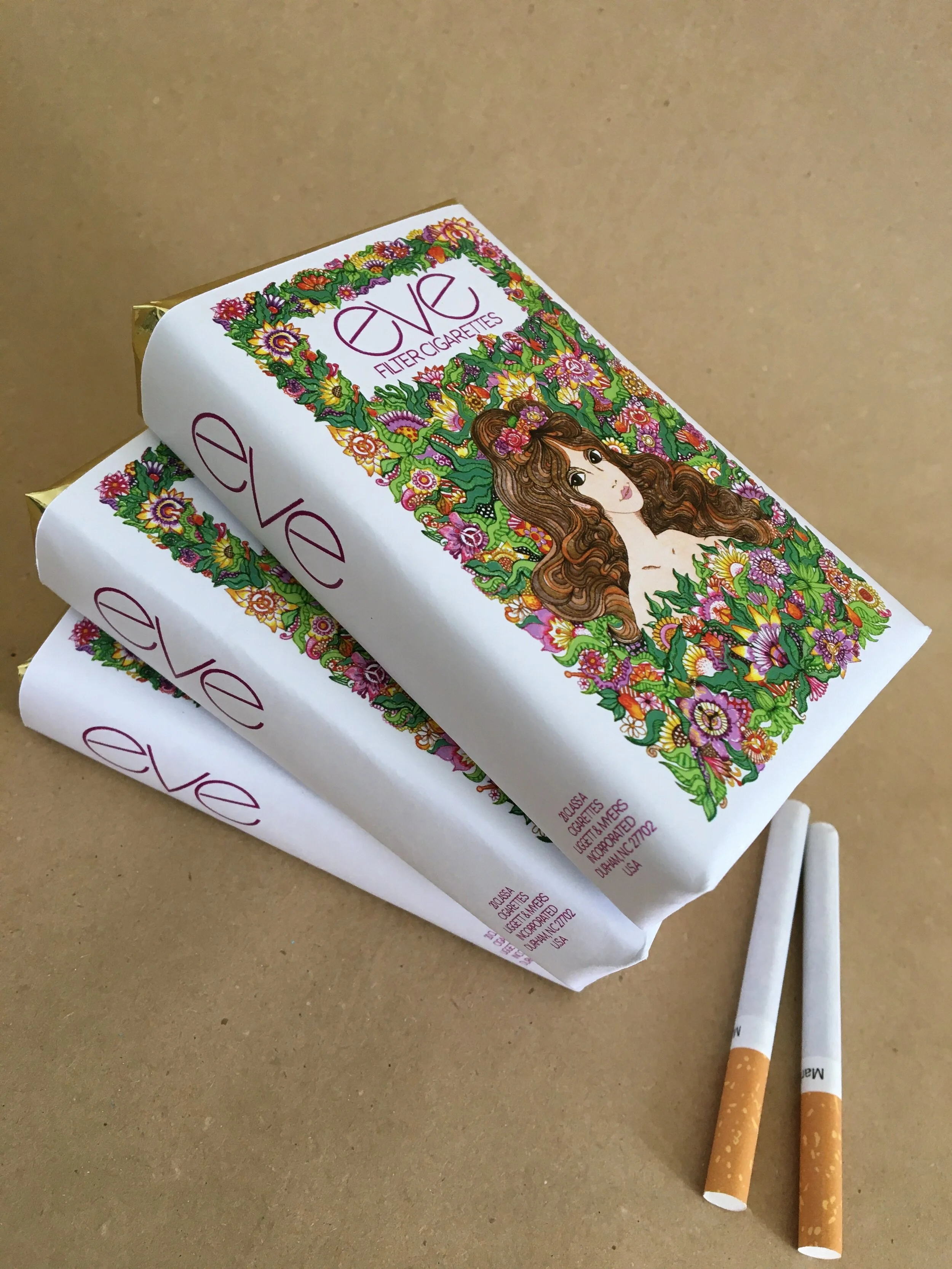 Eve cigarette packet prop | original sister design to John Alcorn’s 1970’s pen and ink illustration commissioned by Phillip Morris. Illustrated, measured, cut and then erected with cartridge paper. Features original hand drawing, sleeve printed on satin 160gsm paper with gold foiled box.